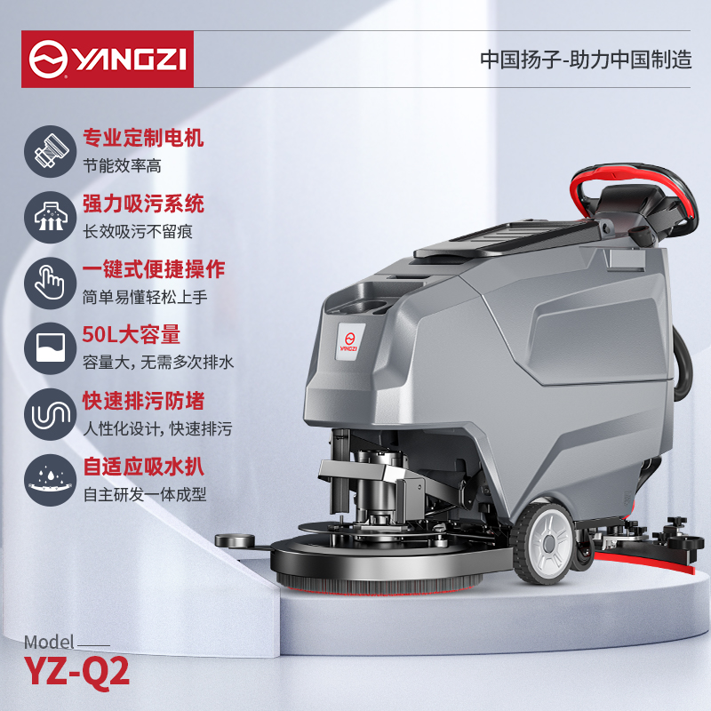揚子洗地機Q2輔助輪+動力刷盤雙配置,輕松不費力清潔更省心,LDPE滾塑工藝,耐高溫耐腐蝕超耐用機身,3290㎡/h清潔效率配合動力系統更快更潔凈。